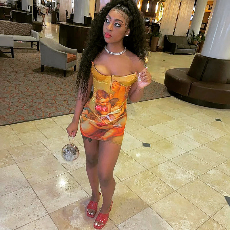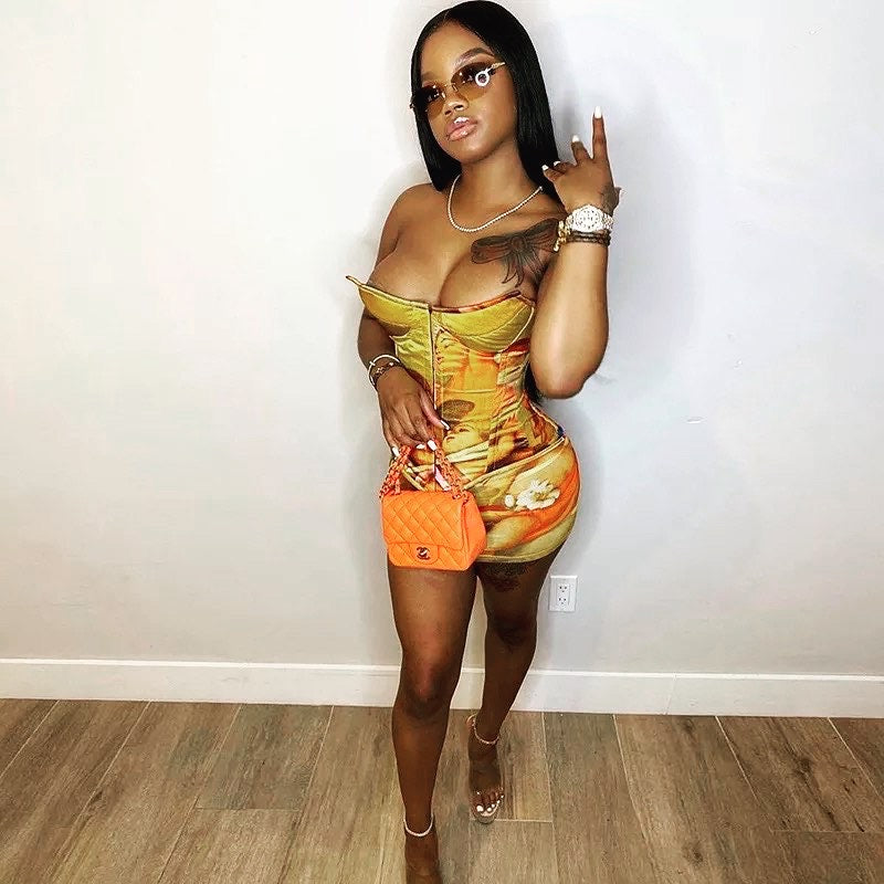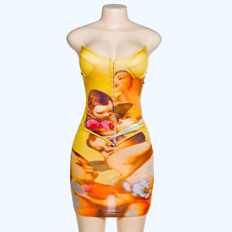 Effortlessly sexy and celestial, the Angelic Mini 🍑 combines an alluring angel print with a corset design and clear straps for a sultry look. The plunging cleavage adds a touch of mystery, making it the perfect piece for a seductive night out.