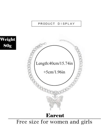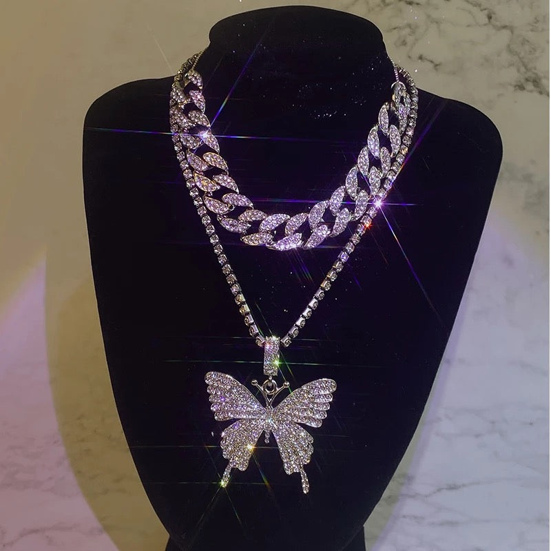 Trendy 2pc fashion rhinestone jewlery set with an adjustable link chain, large butterfly pendant and cuban link choker. Very sparkley, very glamorous.