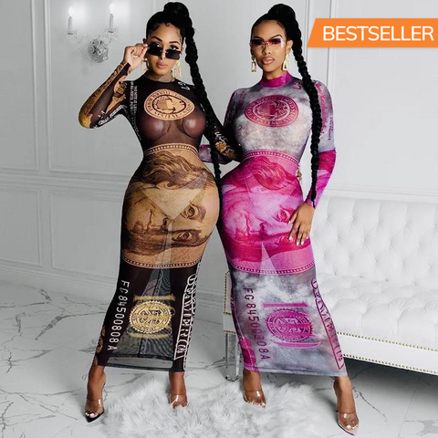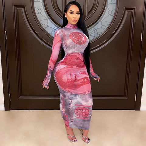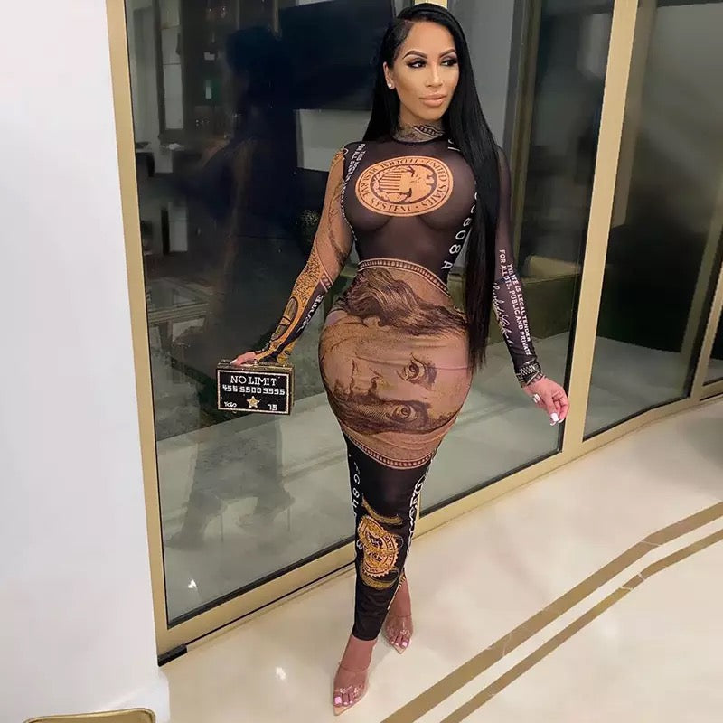 Money print, sheer dress, very light, bodycon, silhouette enhanced