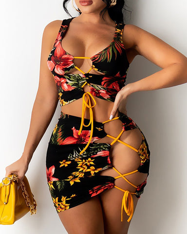 Introducing the Chun Li - a stylish and trendy ensemble featuring a laced crop top and a side laced skirt with a vibrant tropical design. This outfit is perfect for any occasion, providing both comfort and fashion in one complete look.