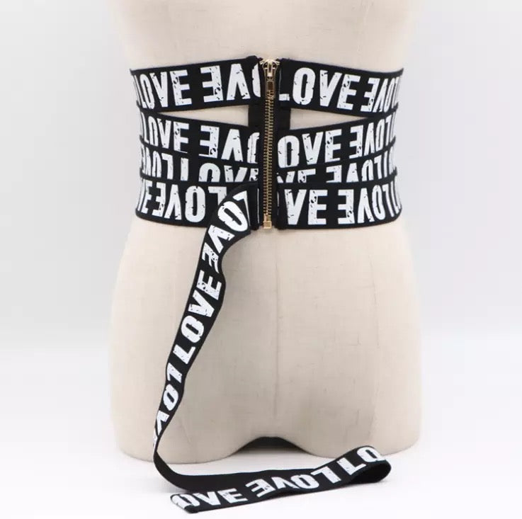Graffiti graphic print waist clincher, 'Love' written in eraser board font.
