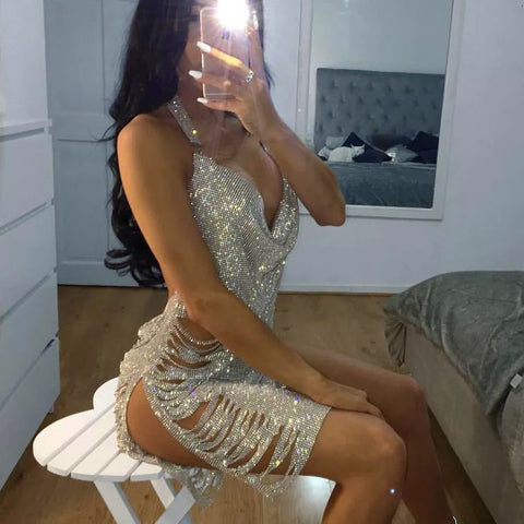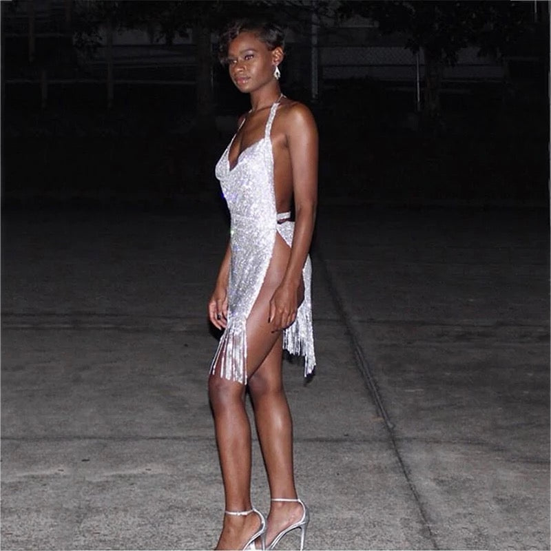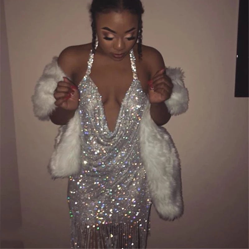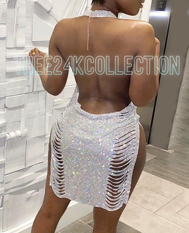 Shimmery, Bold, High split, haltered mini, around the neck haltered strap with rhinestone clasp, low plunged neckline, ladder slits front and back, sequins material.