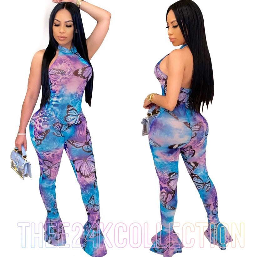 Vintage, jumpsuit, Mesh material giving major silhouette vibes, cute butterfly print for a classic feminine look; sleeveless, backless, and haltered